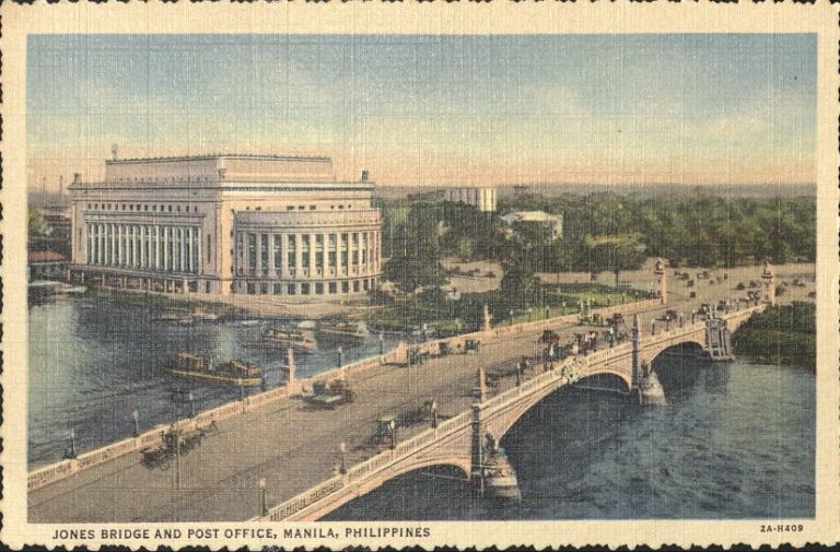 Subject: The neoclassical Post Office, completed in 1930 after several delays, sits on the Pasig River at Jones Bridge for easy access and dispatch of mail.