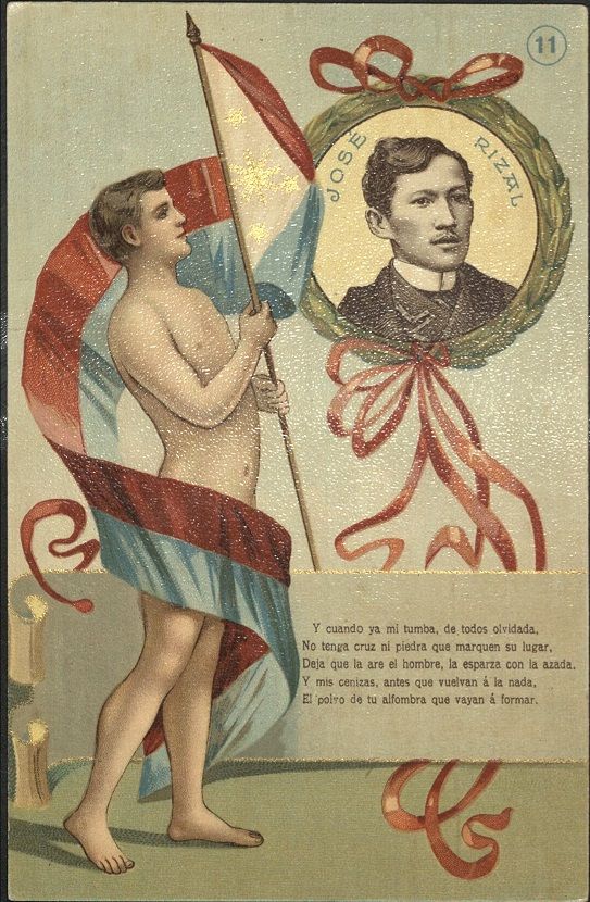 Subject: Portrait of Jos� Rizal, naked man holding Philippine flag, and eleventh stanza of �Mi Ultimo Adi�s.�