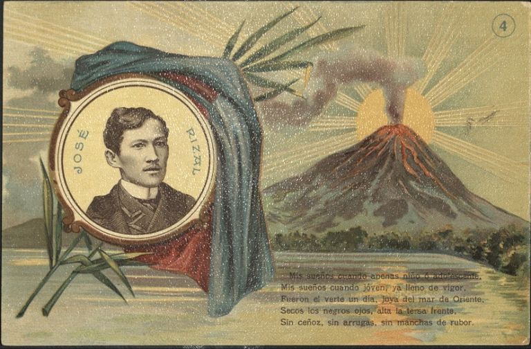 Subject: Portrait of Jos� Rizal, Philippine flag, sunset over erupting volcano, and fourth stanza of �Mi Ultimo Adi�s.�