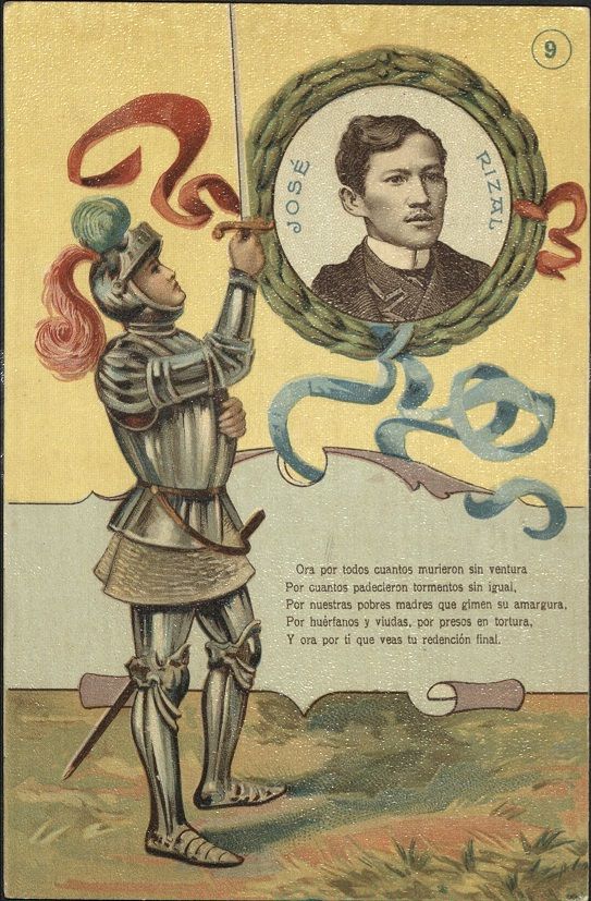 Subject: Portrait of Josie Rizal, knight in suit of armor with sword, and ninth stanza of Mi Ultimo Adios.