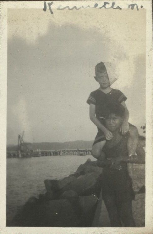 Subject: Kenneth is likely the son of a military officer at Fort Wint. Here he sits on someone's shoulders at the shoreline of Grande Island, with the pier of Fort Wint in the background.