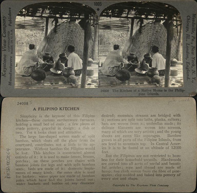 Keystone #K24008. Two Filipino women cook over clay-pot stoves (palayok) in a nipa hut with bamboo floors and screens.