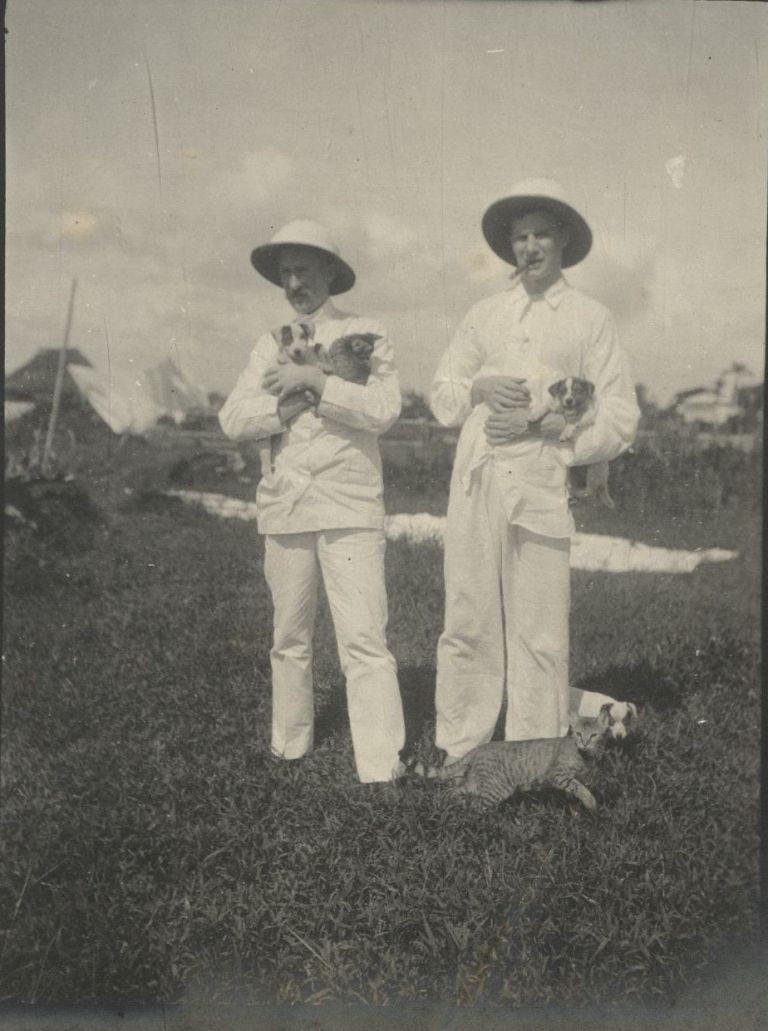 Subject: Two expatriate men dressed in tropical white suits and pith helmets hold armfuls of puppies or small dogs. A cat and dog play at one man's feet.