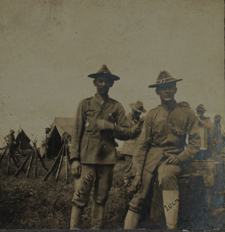 Subject: Two U.S. soldiers, army buddies of the photographer, pose at a military camp (probably Camp Wallace).