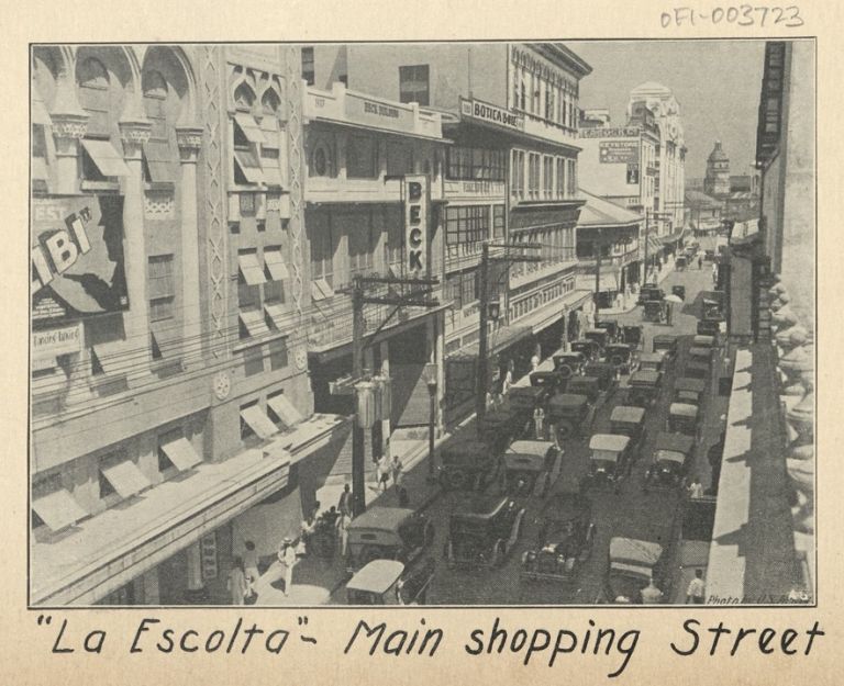 Subject: Looking east down Escolta Street in Binondo, Manila, crowded with 1920s-era automobiles. Santa Cruz Church appears in the distance at the end of the street. See OFI-