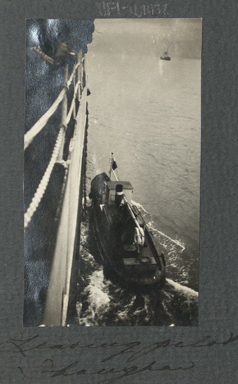 Subject: View from the railing of a passenger ship looking down on a pilot boat as the ship leaves Shanghai and enters the East China Sea.