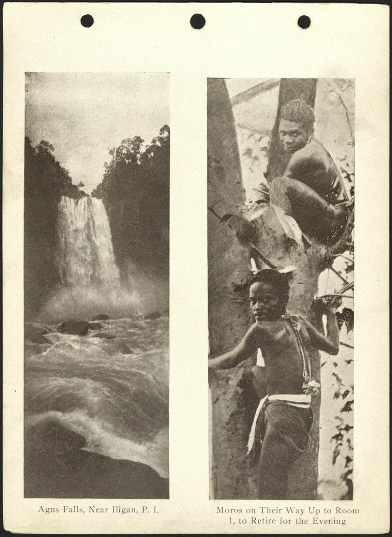 (Left) Moros on their way up to Room 1, to retire for the evening. / (Right) Agus Falls, near Iligan, P. I.
