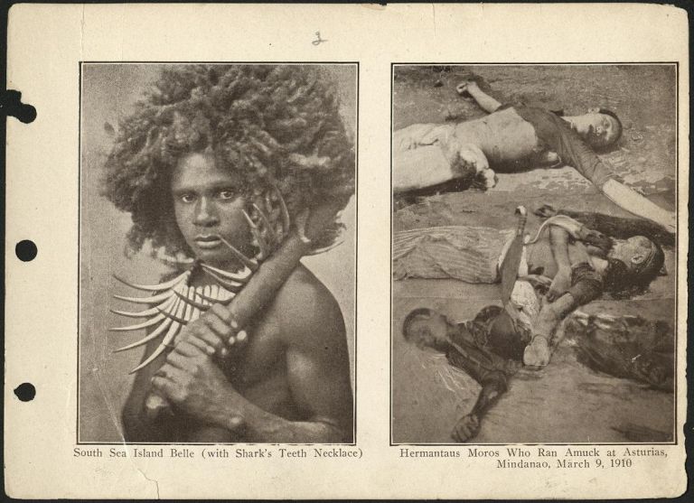 (Left) South Sea island belle (with shark's teeth necklace). / (Right) Hermantaus Moros who ran amuck at Asturias, Mindanao, March 9, 1910.