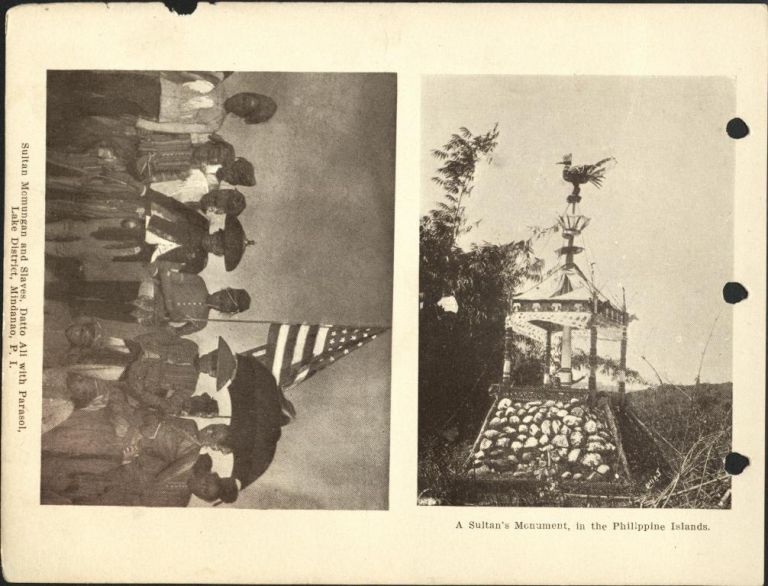 (Left) A sultan's monument, in the Philippine Islands. (Right) Sultan Momungan and slaves, Datto Ali with parasol, Lake District, Mindanao, P. I.