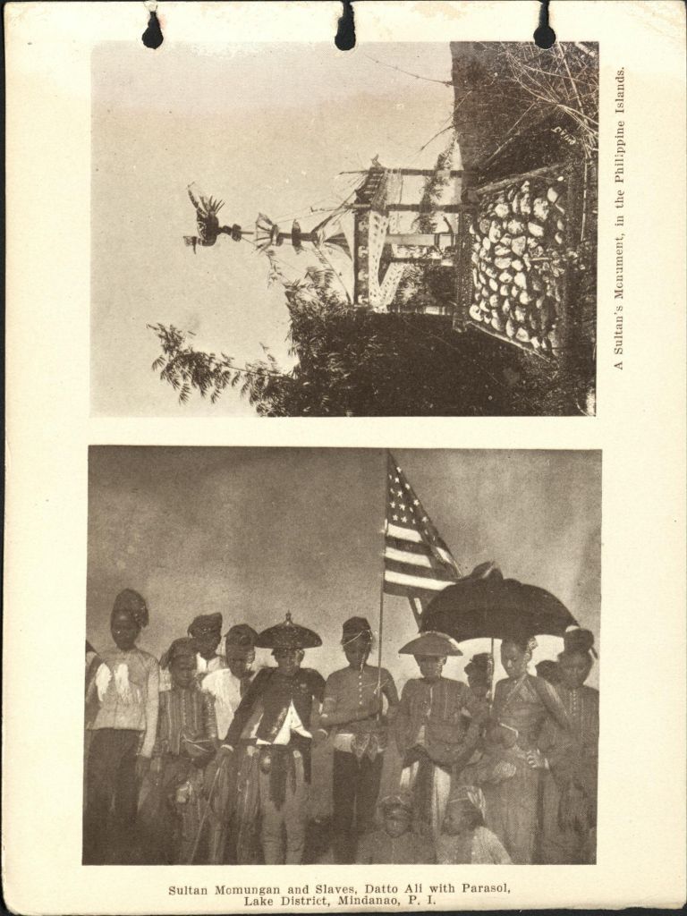 (Left) A sultan's monument, in the Philippine Islands. (Right) Sultan Momungan and slaves, Datto Ali with parasol, Lake District, Mindanao, P. I.