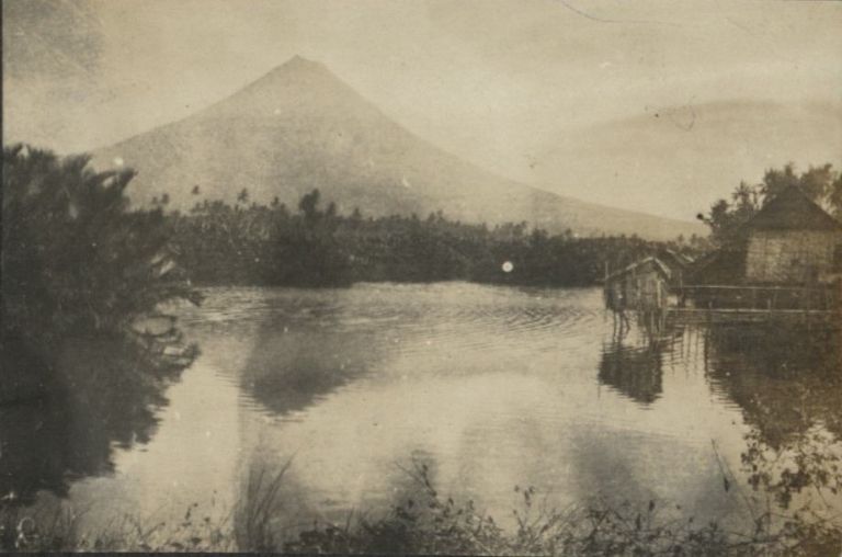 Subject: Some nipa huts built out over the river in Legaspi City with Mt. Mayon (Mayon Volcano) in the distance.