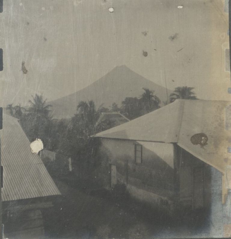 Subject: View taken from an upper story or roof looking over houses in Legaspi City towards Mayon Volcano in the distance.