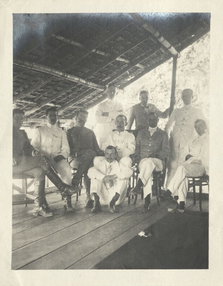 Subject: Ten expatriate men pose for a group portrait under a thatched roof. See also OFI-002455 for a virtually identical image.