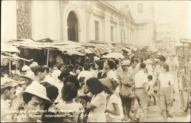 Subject: Crowded street scene beside Quiapo Church as internees mix with their U.S. liberators after the liberation of Santo Tomas Internment Camp, Feb. 1945.