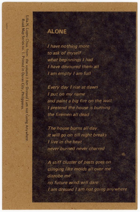 Poem, "Alone" by Lilia N. Lopez Chua. Road Map Series No. 1. Road Map Series is an independent art-house publication in Davao edited by Tita Lacambra Ayala.