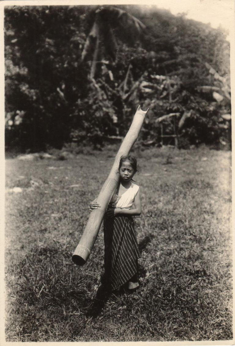 Subject: A young Filipina poses with long, hollow bamboo tube used to transport water, a common method of carrying water. Search for subject = "water carriers" for similar images. Jaro is one of the s