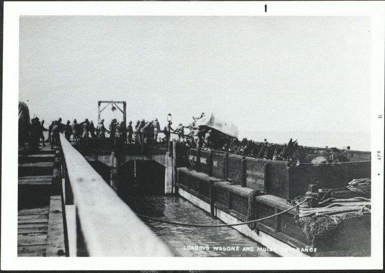 Subject: Soldiers line up on pier at Los Banos, loading mules and wagons on a barge for transport across Laguna de Bay. A 1981 reprint of an earlier image.