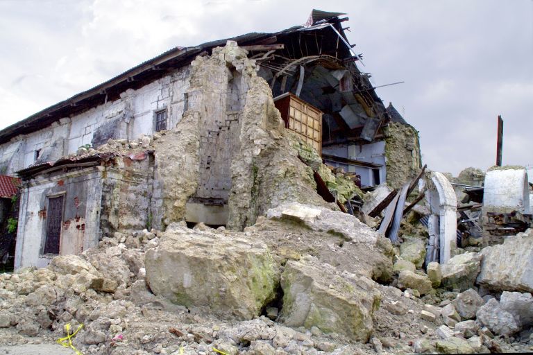 Subject: Earthquake-damaged structure of San Pedro Apostol Parish Church, commonly known as Loboc Church. Compare this image to OFI-003785. The deficiencies in construction are readily apparent: Loose