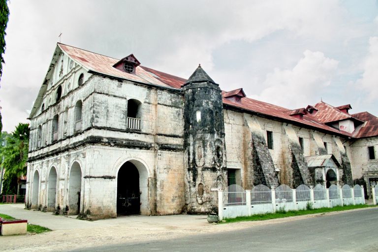 Subject: Exterior view of buttressed walls of San Pedro Apostol Parish Church, commonly known as Loboc Church. The parish was established in 1602, and the present coral stone church was completed in 1