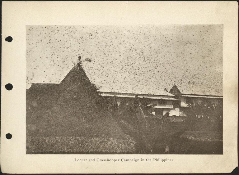 Subject: A cloud of locusts swarm while Filipinos try to catch them in nets. Probably Locusta migratoria manilensis, commonly known as the Oriental migratory locust. It is normally a soli