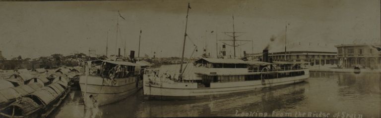 Subject: View from Bridge of Spain looking at a sea of cascos (local freight barges), small passenger steamers, and sailing ships on the Pasig River. A similar view is seen in OFI-002054.