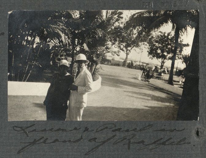Subject: Two American or British tourists stand in front of the venerable Raffles Hotel in Singapore. Raffles Hotel is a colonial-style luxury hotel in Singapore. The hotel was established