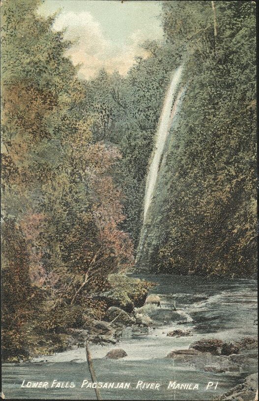 Subject: Waterfall down steep, forested canyon walls of Pagsanjan Gorge.