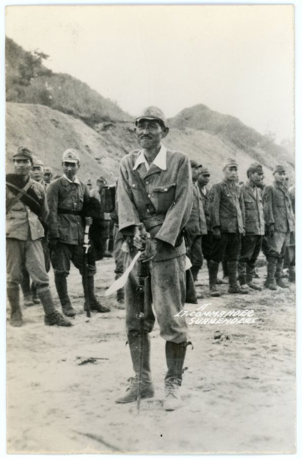 Surrendering Japanese military officer with his troops. Location not given but likely Central or Northern Luzon. Images in this album are from an American soldier in the U.S. Army 13th Air Force stationed at Clark Field.