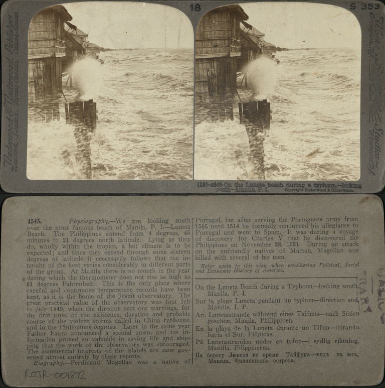 Underwood #U4545. Heavy waves from Manila Bay crash into shore and bamboo houses during a typhoon.