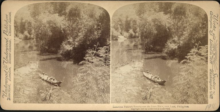 Underwood #U395a. Boating party paddles down tree-lined Imus River in Cavite Province, Philippines. Imus was the site of two major victories of the Katipuneros during the Philippine Revolution against Spain.