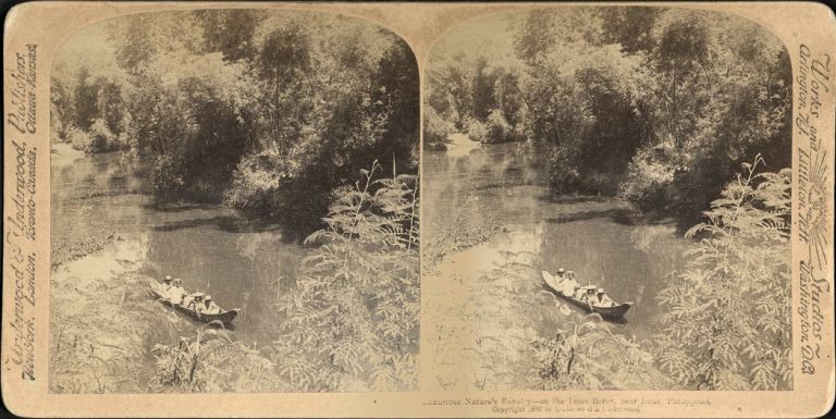 Underwood #U395a. Boating party paddles down tree-lined Imus River in Cavite Province, Philippines. Imus was the site of two major victories of the Katipuneros during the Philippine Revolution against Spain.