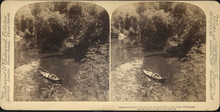 Underwood #U395a. Boating party paddles down tree-lined Imus River in Cavite Province, Philippines. Imus was the site of two major victories of the Katipuneros during the Philippine Revolution against Spain.