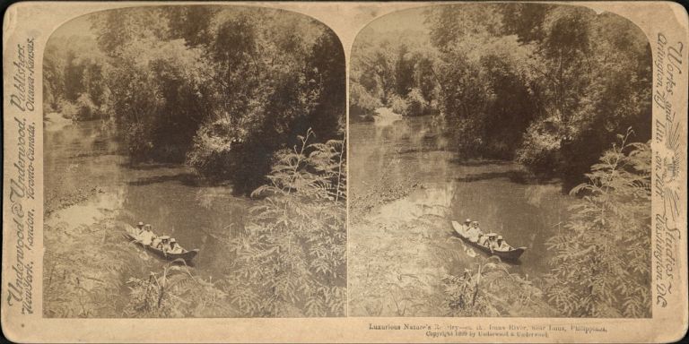 Underwood #U395a. Boating party paddles down tree-lined Imus River in Cavite Province, Philippines. Imus was the site of two major victories of the Katipuneros during the Philippine Revolution against Spain.