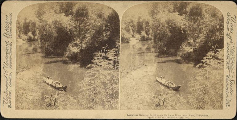 Underwood #U395a. Boating party paddles down tree-lined Imus River in Cavite Province, Philippines. Imus was the site of two major victories of the Katipuneros during the Philippine Revolution against Spain.
