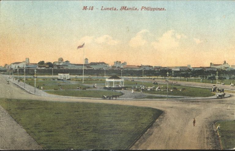 Subject: Luneta Park in Manila with gazebo, flagpole, people and a calesa; Intramuros in distance.