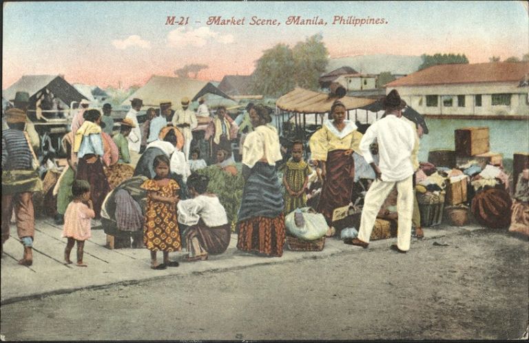 Subject: Busy market scene in Manila with men, women, children, and baskets of goods.