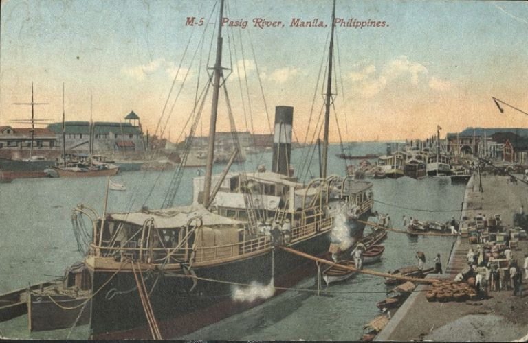 Subject: Steamship freighter loading cargo at wharf on Pasig River, Manila.
