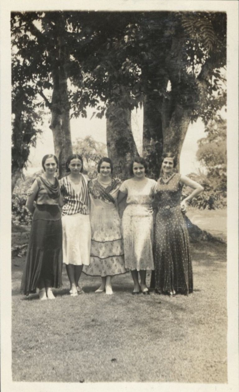 Subject: Several of Harry Hawkins, Jr.'s female friends of Spanish heritage outdoors in formal dress. Harry Jr. left no description of how he knows these people or what event is pictured.