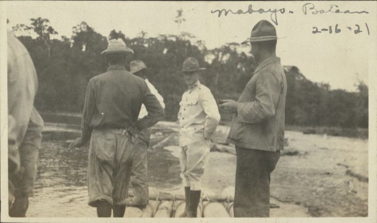 Subject: American officers talk to Filipino workers while standing on logs for pilings on the shore in Mabayo, close to Grande Island. Mabayo is a barangay in Morong in Bataan Province, nearby Dapua P