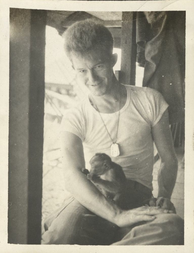 Subject: Pet macaque playing with soldiers, presumably of the 29th Engineers. The Philippine long-tailed macaque (Macaca fascicularis philippensis) is a subspecies of the crab-eating macaque. See also