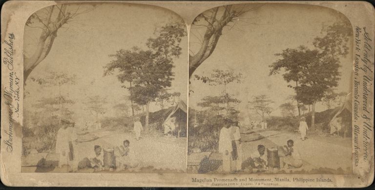 Underwood #U90a. The Magellan Monument was erected in 1848 by the orders of Gobernador-General Narcisco Claveria. It was originally located at the center of Paseo de Magallanes just outside the northern walls of Intramuros, near the Puerta de Isabel II. W