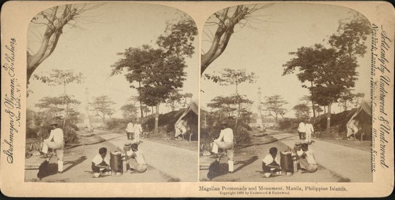 Underwood #U90a. The Magellan Monument was erected in 1848 by the orders of Gobernador-General Narcisco Claveria. It was originally located at the center of Paseo de Magallanes just outside the northern walls of Intramuros, near the Puerta de Isabel II. W
