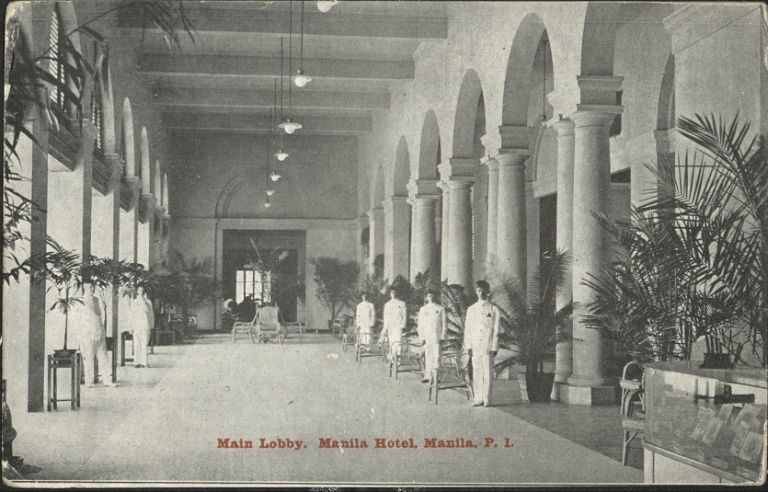 Subject: High-ceiling lobby of Manila Hotel in Ermita, Manila, with Colonna and four lobby boys in white.