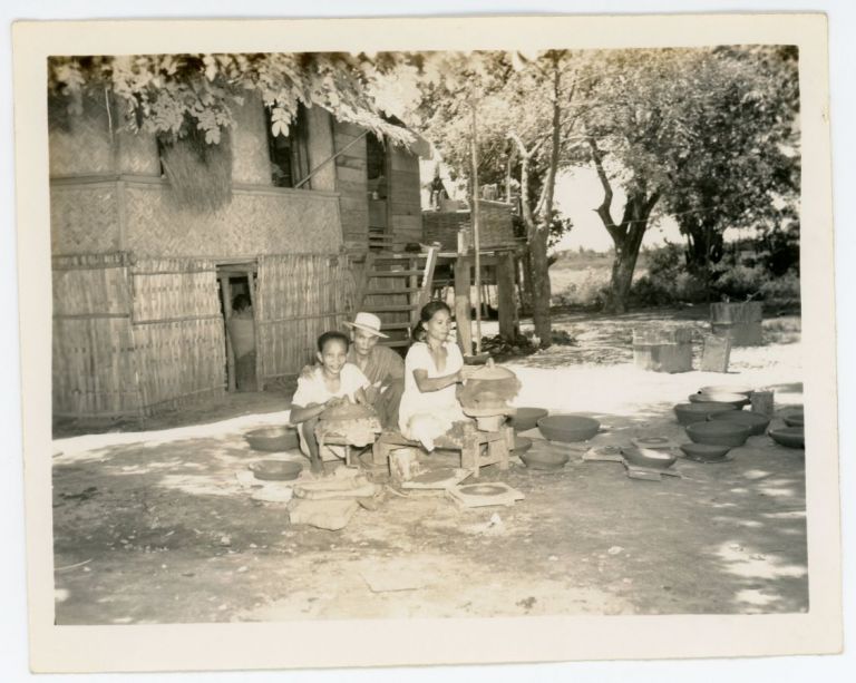 A Filipino family make pottery bowls outside a home or small factory in Pampanga. Images in this album are from an American soldier in the U.S. Army 13th Air Force stationed at Clark Field.