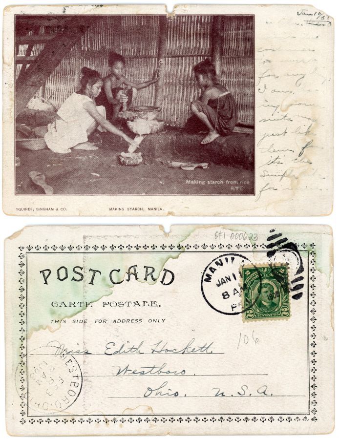 Three young Filipino women making starch from rice through a series of clay pots. Rice starch, largely used in laundry work, is normally prepared from broken white rice.