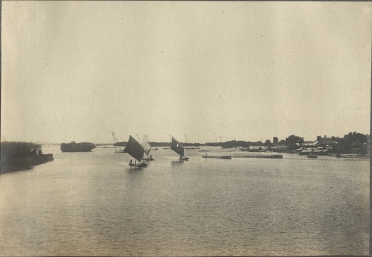 Subject: The river at Malabon, likely seen from the bridge seen in OFI-002752. The boats appear to be a combination of freight boats closer in and seine netters - see also ROJR-000372.