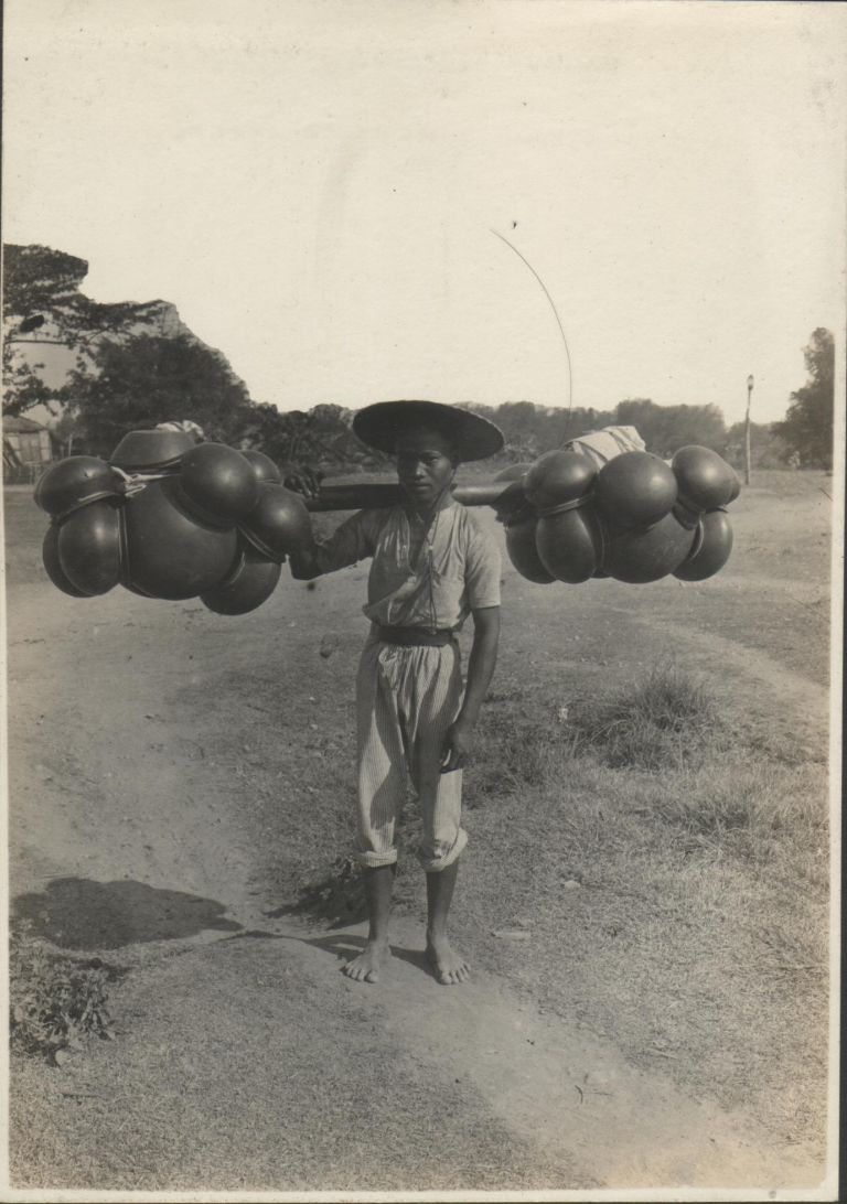 Subject: A man transports finished pottery bowls on a bamboo shoulder pole, well-balanced to distribute the weight evenly. Dingras is a second class municipality in south-central Ilocos Norte province