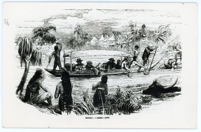 Reproduction of an engraving or etching showing a boating party and river life on a Philippine river, from the collection of the Museum of Filipino Culture.