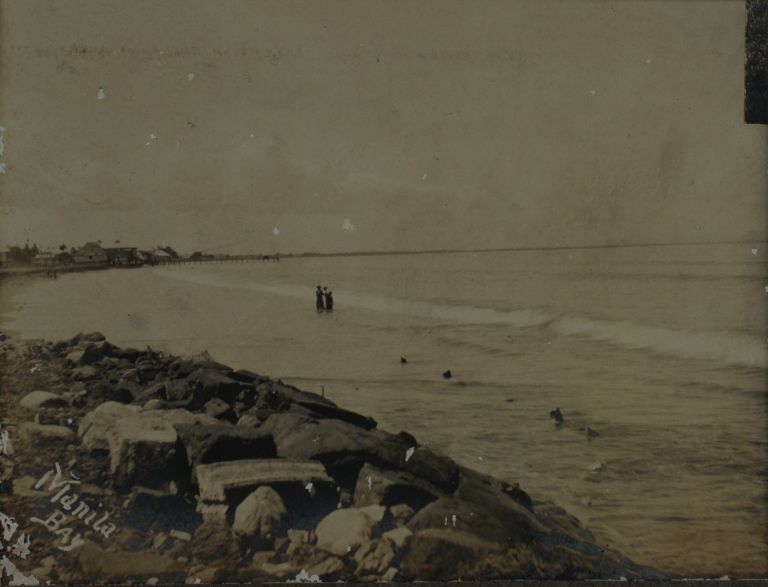 Subject: Good view of the sea wall of Manila Bay and the rock and rubble used to prevent erosion. A couple of people bathe in the waters.