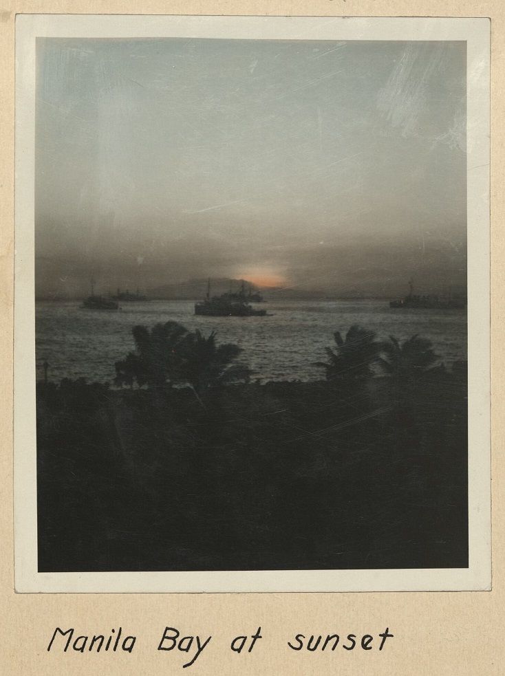 Subject: Sun setting over mountains behind Manila Bay illuminates ships at anchor in the harbor.